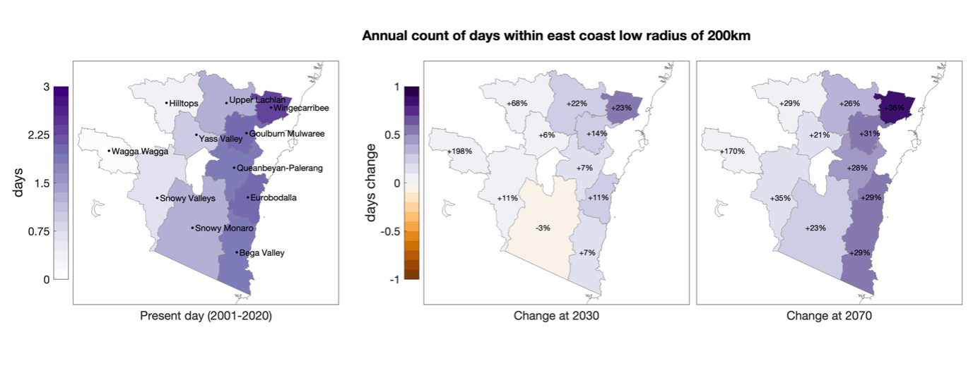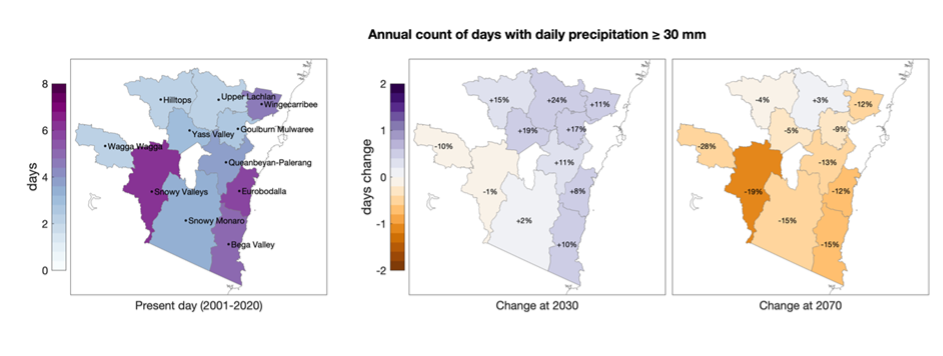 Under present day climate there are on average four very heavy rainfall days per year with highest frequency in Snowy Valleys and the coastal LGAs of Bega Valley, Eurobodalla and Wingecarribee. Maximum 1-day rainfall totals are highest at the coastal LGAs and are likely to be associated with east coast lows.