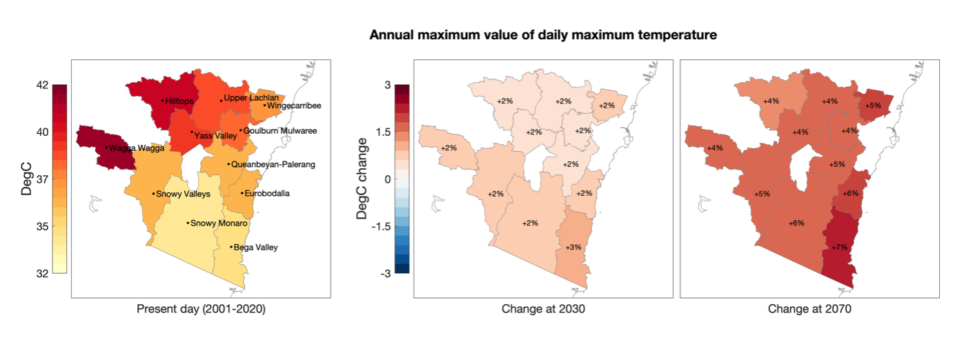 Across South East NSW, temperatures are increasing as a result of climate change (AdaptNSW, 2022). The CRJO region currently experiences an average of 8 days per year with temperature over 35 degrees Celsius, and the hottest daily temperature is on average 37degrees Celsius. By 2070 under RCP4.5 there is expected to be on average 14 days per year with temperature over 35 degrees Celsius, and the hottest daily temperature will be on average 39 degrees Celsius. Inland LGAs, especially Hilltops and Wagga Wagga, are more exposed to temperature extremes compared to more coastal LGAs.